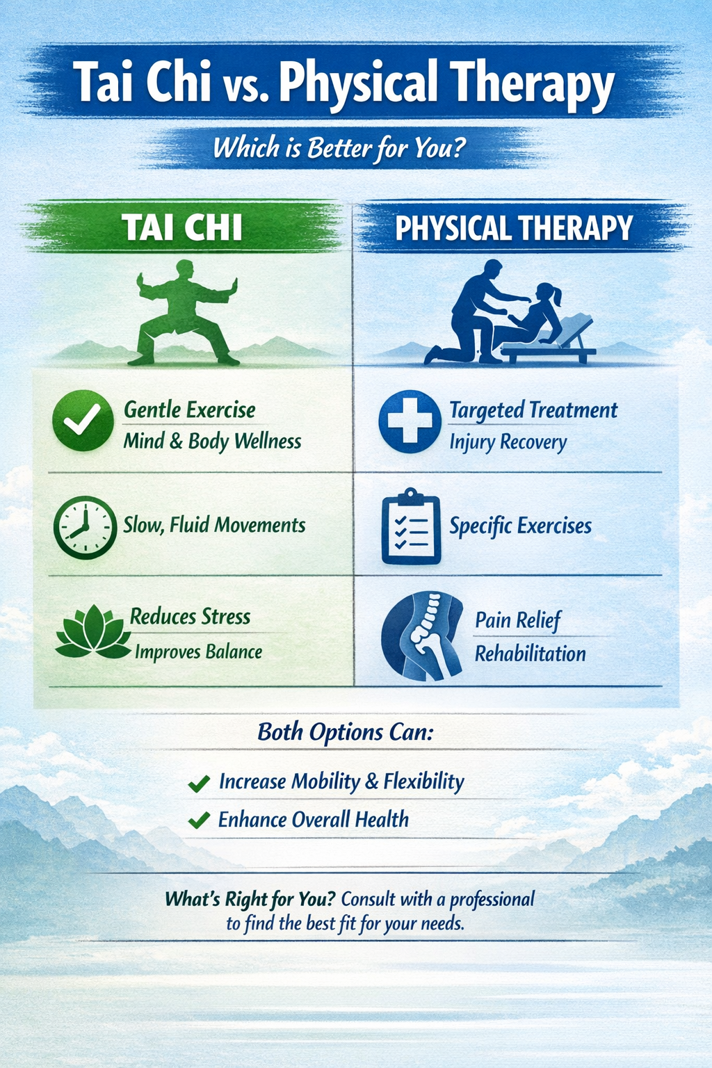 Once seen as a “newfangled” Eastern art, Tai Chi is now recognized as a science-backed tool that bridges clinical treatment and daily life. While traditional physical therapy (PT) focuses on isolating specific muscles or joints, Tai Chi treats the body as an interconnected whole—enhancing recovery in a holistic, sustainable way.